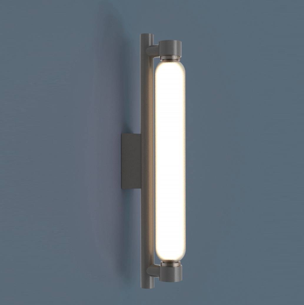 Cette applique est fabriquée à partir de métal gris mat, et d'un diffuseur en verre sur l'ampoule à incandescence d'origine.
