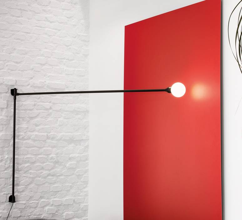 Potence Pivotante est une applique à la fois rétro et moderne. Elle est orientable et décrit un angle de 180° sur l’axe horizontal. Elle se compose de deux branches en aluminium noir mat et d’un globe en verre opalin. Ce diffuseur disperse ainsi la lumière de manière légère. Une applique digne d’une des plus grande architecte française…