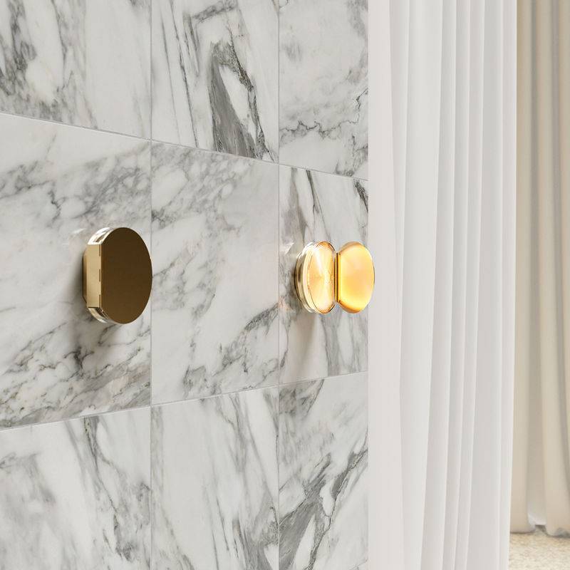 Cette applique ronde en acier doré ressemble à un précieux poudrier que l’on peut ouvrir ou fermer à sa guise. A l’intérieur du boîtier doré, un épais disque-diffuseur en verre exploite la source LED, fournissant un éclairage fonctionnel et non éblouissant.