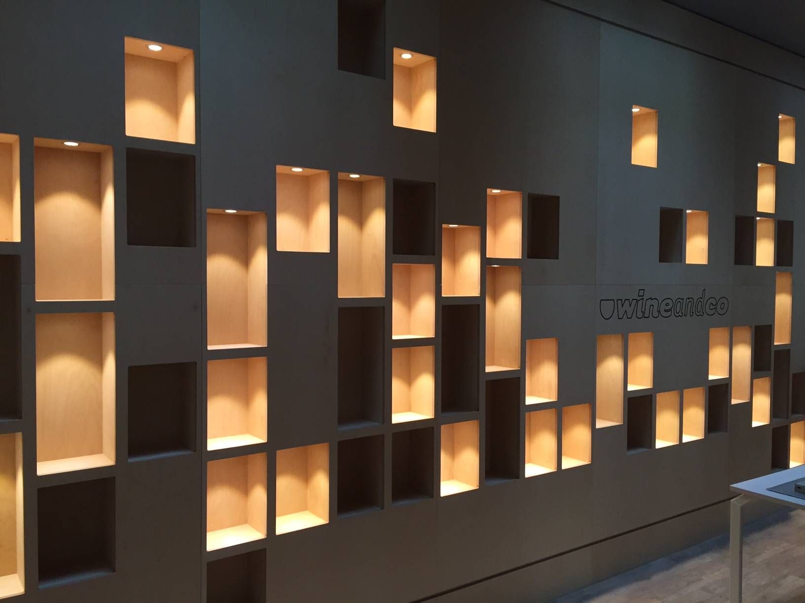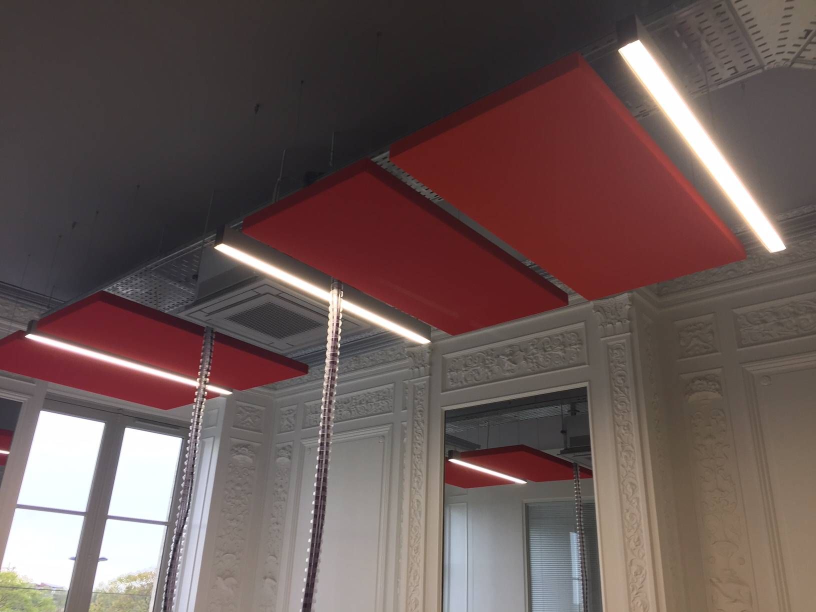 Luminaires linéaires Sfel en LED dimmable dans l'ensemble des bureaux. Pour la salle de dégustation, un meuble en fabrication spéciale à reçu une multitudes de spots encastrés !!!