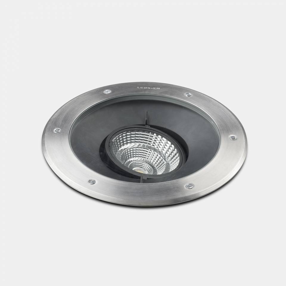 Encastré de sol en fonte d'aluminium, collerette en inox AISI 304 ou 316, IP67, IK08, lampe GU10 50W halogène ou 7W LED orientable, livré avec pot d'encastrement PVC.