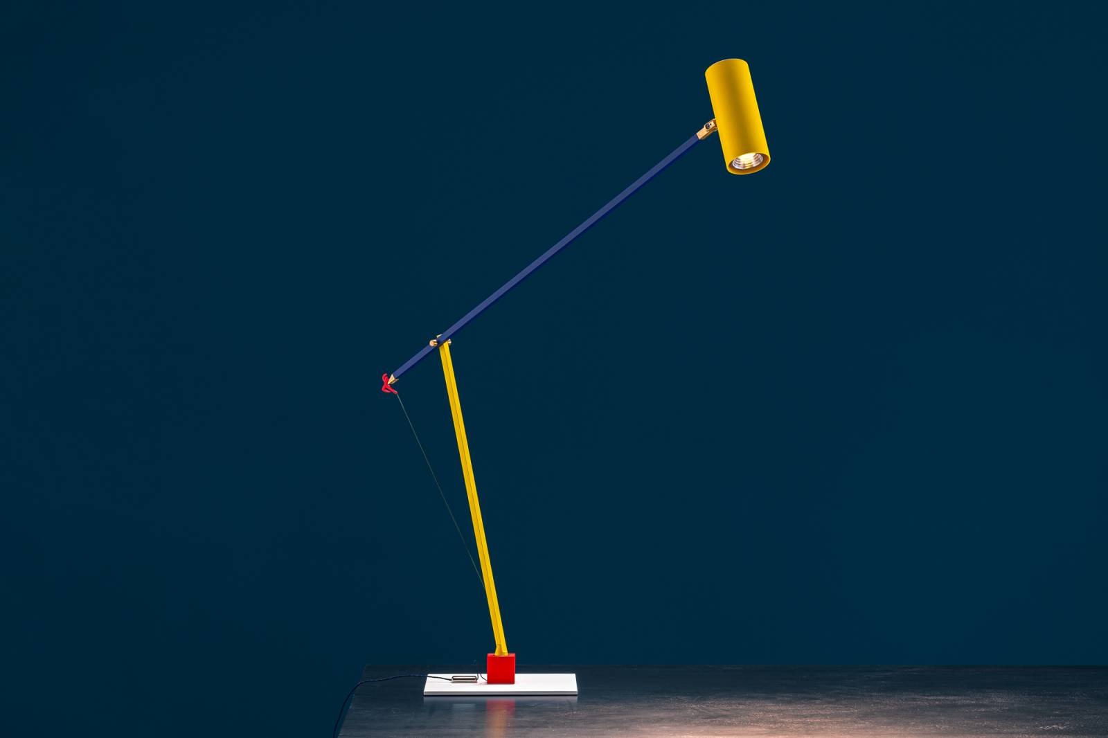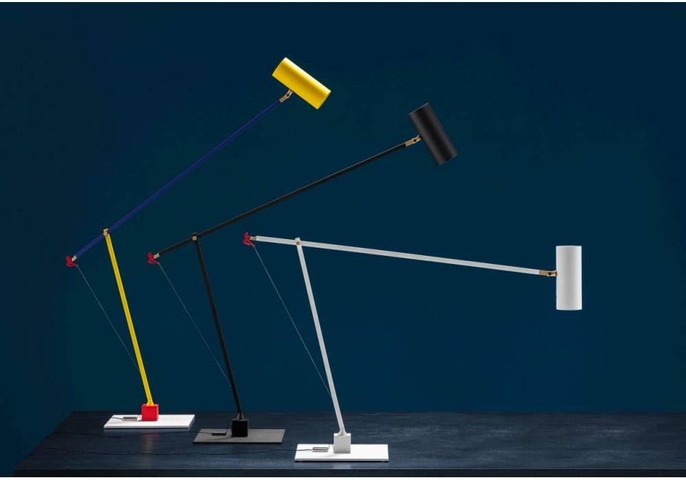 ETTORINO, design Enzo Catellani..... “C’est en 2004 que la couleur fit sa première apparition dans notre catalogue. La collection s’appelait Postkrisi. La couleur, symbole de renaissance, de joie. Aujourd’hui, cette couleur retrouve sa place. » Également disponibles dans les finitions classiques noire et blanche, les lampes Ettorino jouent dans la version « colourful » avec l’élégante combinaison de couleurs primaires, mêlant bleu, jaune et rouge. Précédées par le développement d’un système cinématique innovant et breveté, ces nouvelles lampes articulées se caractérisent par un design essentiel, personnalisé par des détails inattendus. La présence d’une silhouette rouge, détail fonctionnel à la forme dansante, caractérise toutes les lampes. Ettorino T est conçue comme une lampe de bureau, pour fournir un éclairage approprié sur le plan de travail, grâce à la possibilité de mouvement et de rotation de la lampe.