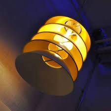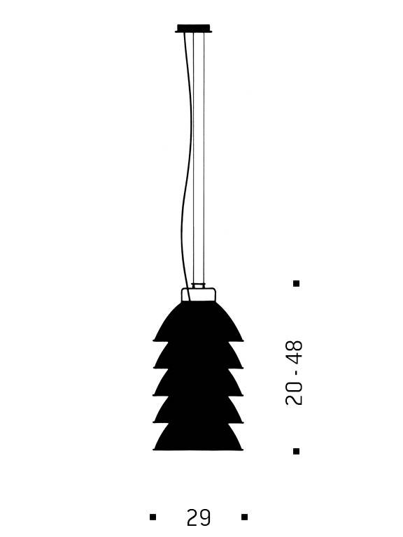 Acier. Cinq réflecteurs, Ø 28 cm, extérieur vernis en blanc mat, l'intérieur est vernis en jaune et blanc. L'effet lumineux est variable pour régler la distance entre les réflecteurs.