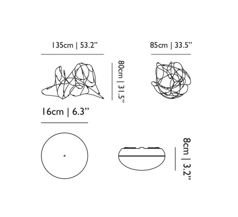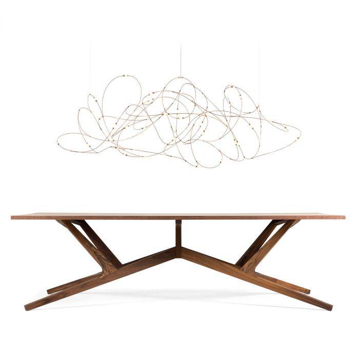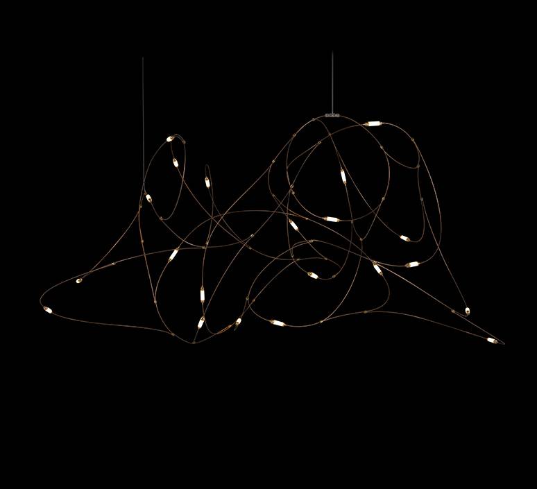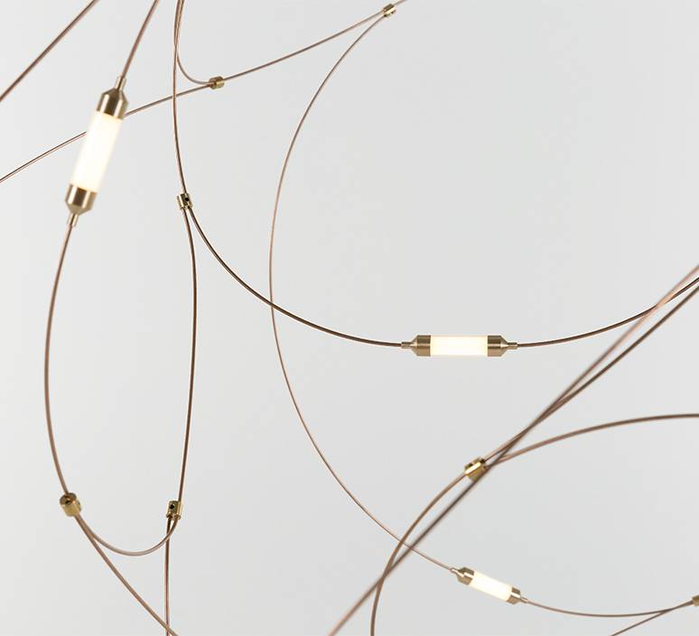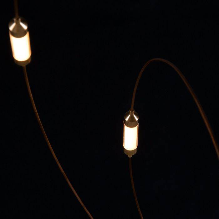 Matériaux : fils de bronze, coupelles en laiton avec diffuseurs en polycarbonate semi-transparent