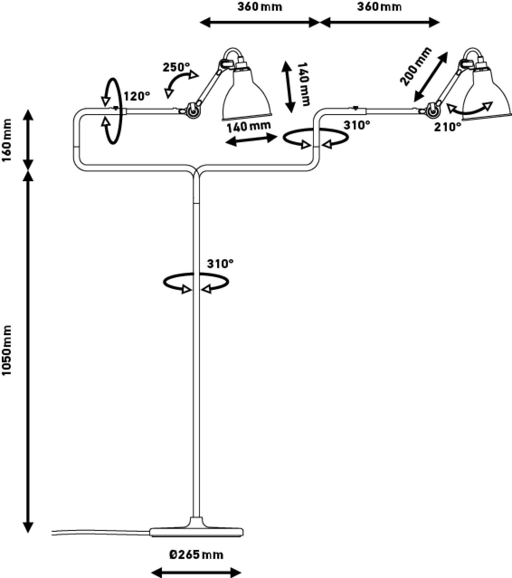 Chaque bras articulé pivote à 310° sur son axe, la bielle supportant le réflecteur pivote également, et le réflecteur est orientable, ce qui rend ce lampadaire très fonctionnel et polyvalent. Il se pliera réellement à tous vos besoins.