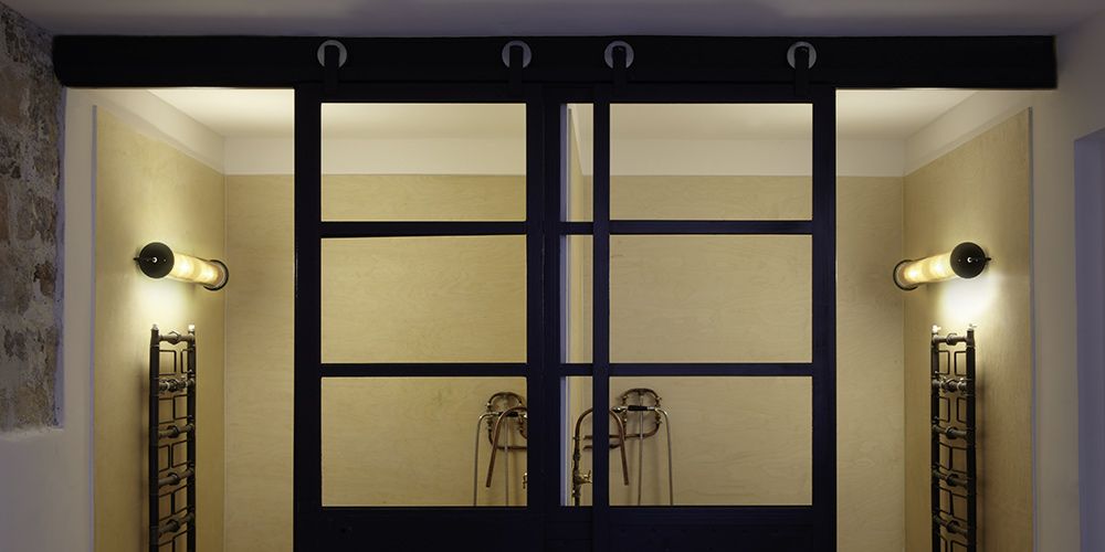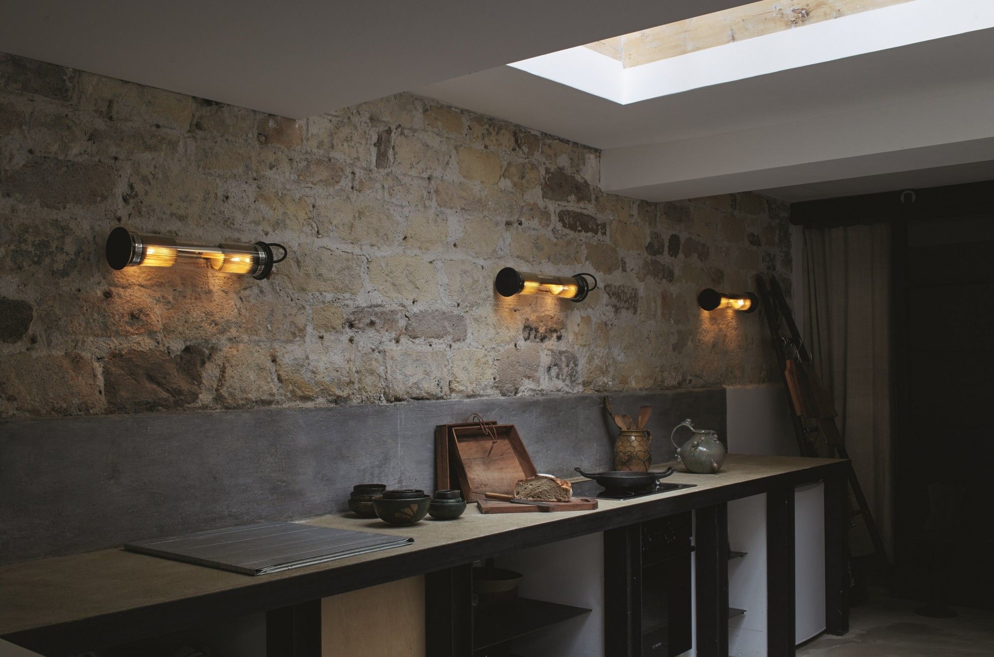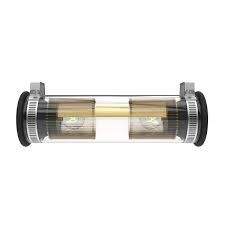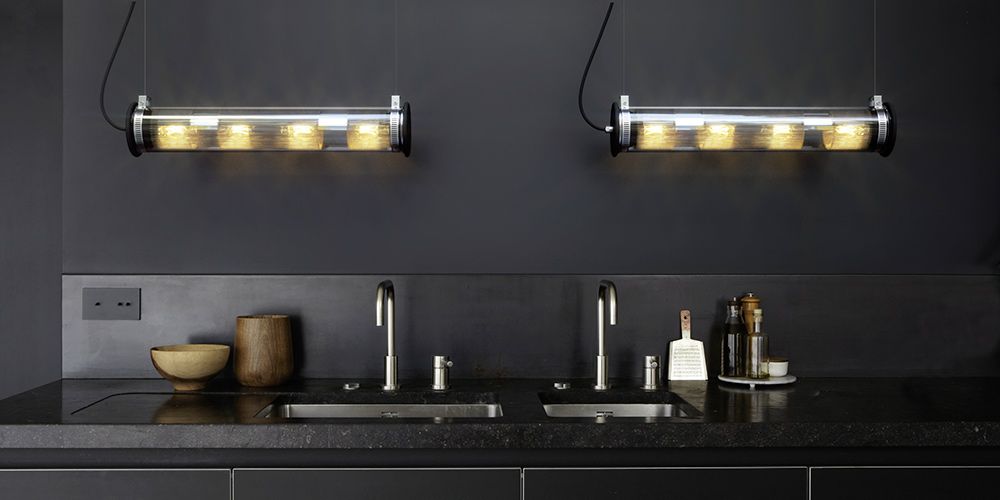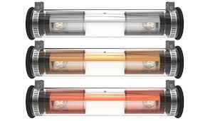 Tube en verre borosilicate, bouchons étanches en silicone et fonte d'alu noirs, colliers acier inox, réflecteur alu et acier inox, câble caoutchouc noir, IP64. En 2xE14 pour les tailles 1 et 2 ; 4xE27 pour la taille 3 et 6xE27 pour la taille 4.