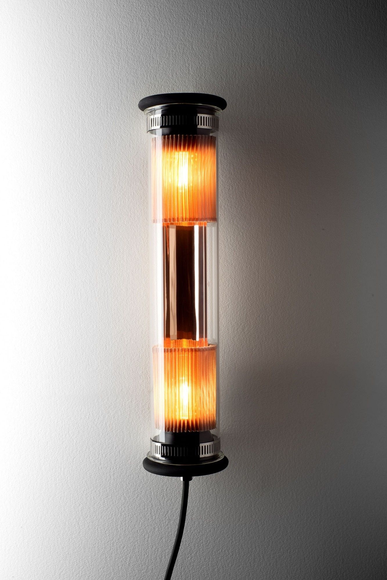 Luminaire inédit, original,durable, intemporel, issu de l'architecte dominique PERRAULT et de la designer Gaëlle LAURIOT-PREVOST, proposé en plusieurs versions de longueurs, diamètres et couleurs. en verre borosilicate fermé par des bouchons d'alu et recouvert de silicone, fixation par colliers en acier inox. ce luminaire intérieur ou extérieur peut se placer en en applique, suspension, rampes ; il diffuse une lumière adoucie, dirigée par le simple positionnement de la maille-filtre du réflecteur faconné et dont la couleur est donnée par le matériau utilisé, soit acier inox pour l'argenté et alu anodisé pour le cuivré et doré.
