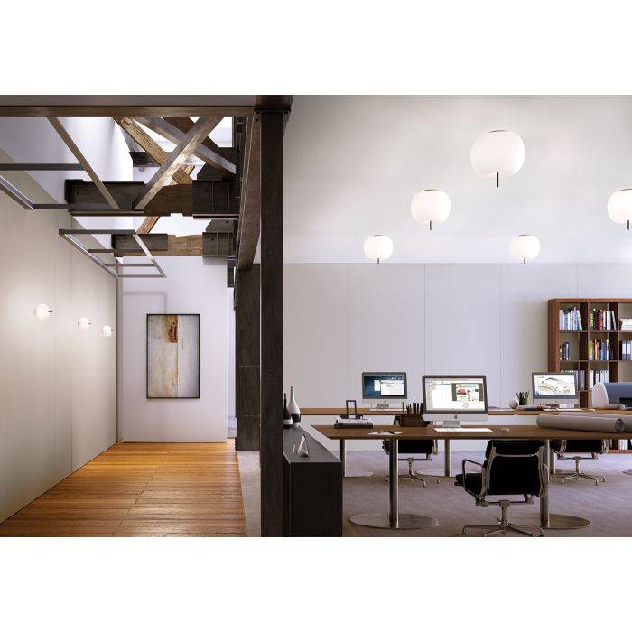 Kushi est une collection de lampes dans lesquelles cohabitent deux éléments purs et antithétiques, tant dans leur forme que dans leur substance. Sobriété, pureté, douceur sont les maîtres mots de ce design ! Ainsi, la baguette métallique, rigide, froide et matériste s'oppose à la douceur veloutée des courbes du diffuseur en verre soufflé et gravé, coexistant dans la même espace, dans une relation continuelle et réciproque, pour donner vie à une collection de lampes très simples dans la forme mais dotées d'une forte personnalité. Cette collection se décline en quatre types de luminaires (suspensions, plafonniers, lampadaires et lampes à poser). Le plafonnier Kushi s'adapte à différentes pièces et apporte un effet très design !