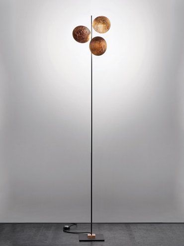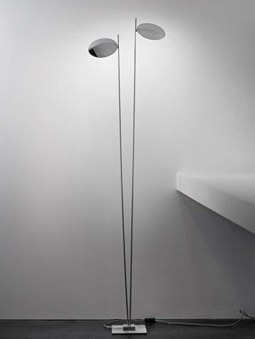 Ce lampadaire raffiné, composé de deux coupoles chromées rotatives à 360° en haut de tiges obliques en métal satiné. cette structure minimaliste et sophistiquée qui joue avec la notion d'équilibre donne un aspect scultural de la lumière. ce produit est décliné en 3 versions (1,2, ou 3 coupoles) et en 5 finitions (or, cuivre blanc, noir, ou chromé), tout comme sa petite soeur lampe à poser, qui ne possède qu'une coupole.