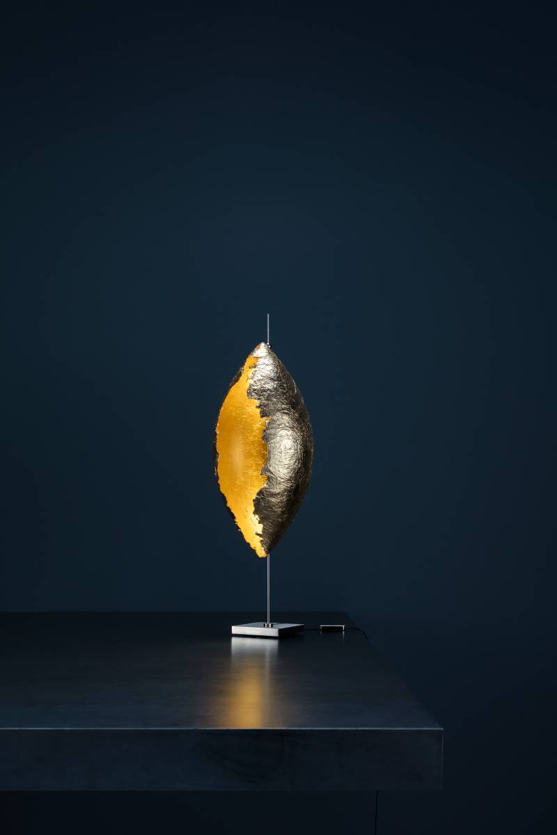 Véritable sculpture lumineuse, cette grande lampe de table LED (H 42 cm) habille votre intérieur par sa présence singulière et onirique. PostKrisi est issue d'un remarquable travail sur la forme et la matière. Elle se compose d'une coque oblongue en fibre de verre recouverte de feuilles d’or appliquées à la main. Ce travail artisanal minutieux donne vie à une superbe texture irrégulière qui joue avec les reflets et la lumière. L'éclairage indirect est doré, chaud et agréable.