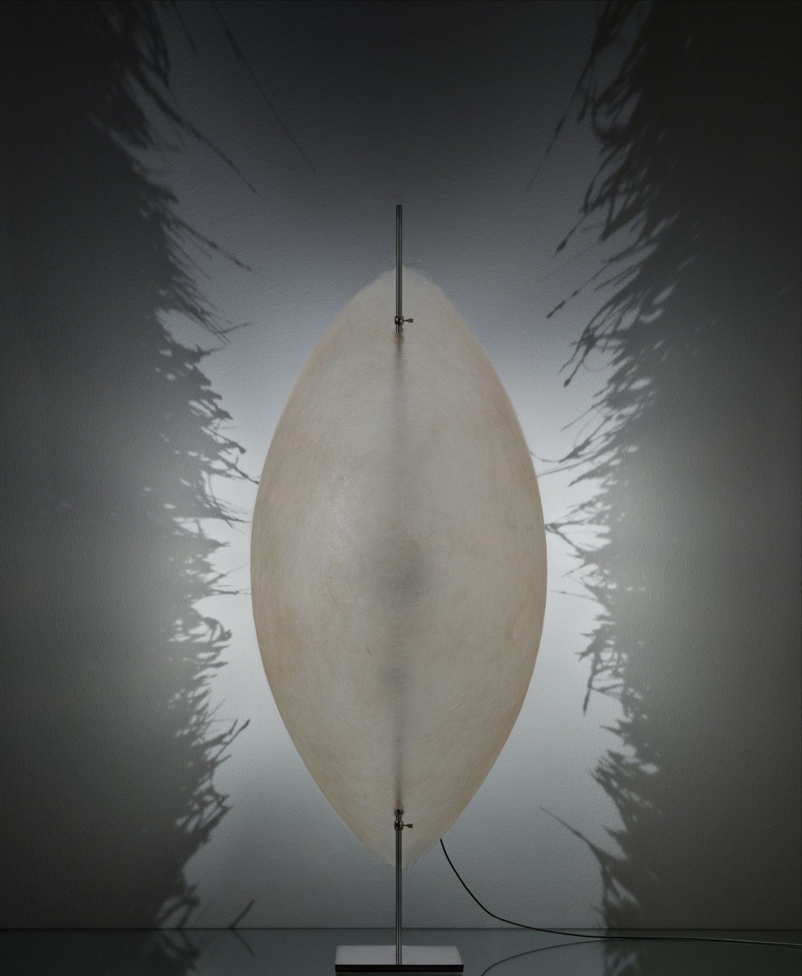 La coque en fibre de verre est traversée d'une en métal. La tige contient deux sources LED (fournies) dont la lumière se reflète et rayonne à l'intérieur de la coque. Lorsqu'on l'allume, PostKrisi éclabousse les murs d'une douce lumière, idéale pour créer une ambiance relaxante. Ce luminaire propose une nouvelle qualité de lumière : une lumière zen, invitant à la contemplation et réduisant les tensions dans l'espace éclairé.