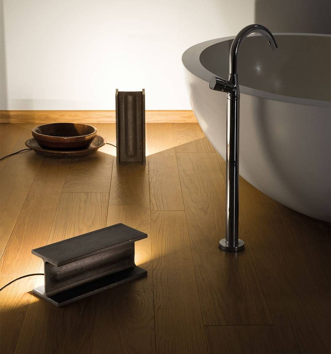 Lampe à poser de Nemo en métal brut, créé par le designer français Rudy Ricciotti, lauréat du grand prix national de l'architecture en 2006. Ce luminaire est traité avec vernis de protection pour l'extérieur, et propose un éclairage chaud et diffus.