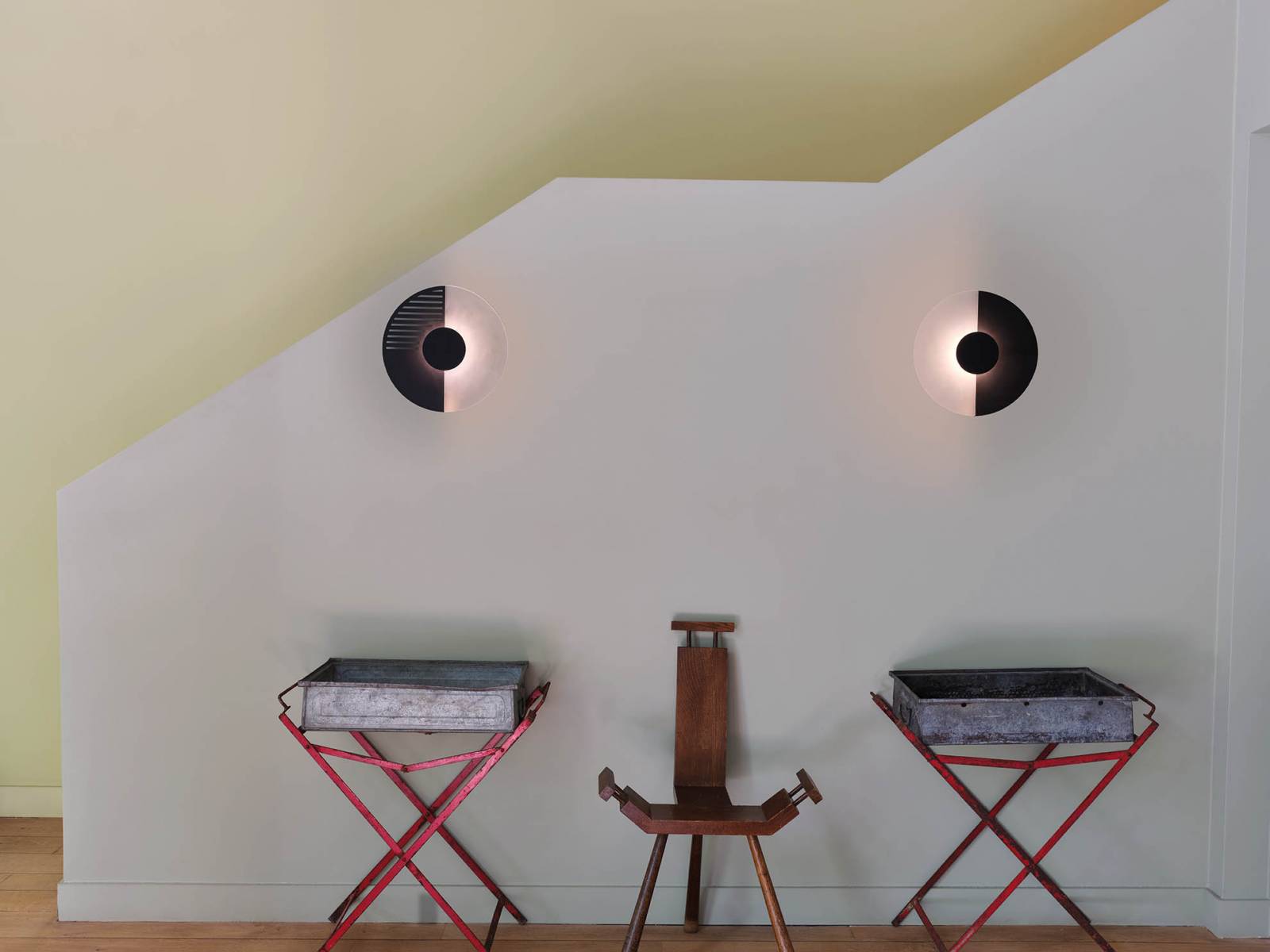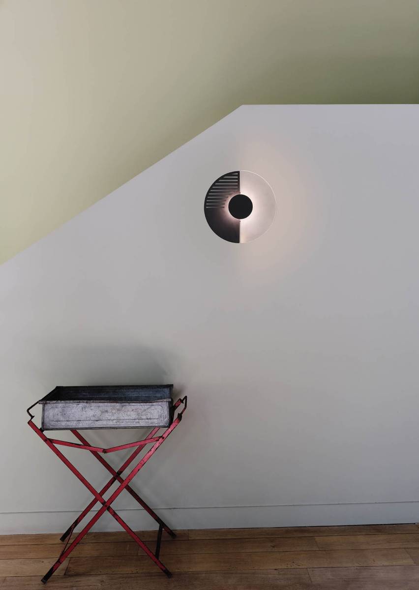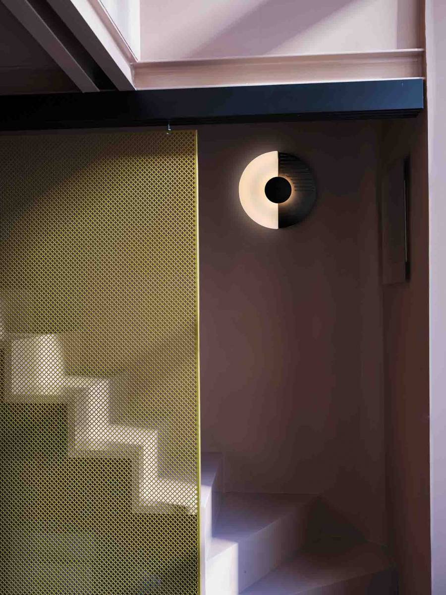 Midnight, applique proposée en deux tailles, est composée de deux demi-disques, l'un en verre dépoli et l'autre en acier noir mat. La partie en acier peut être pleine ou percée de fines bandes qui laissent passer la lumière. Ces multiples possibilités de configurations permettent un jeu ludique, totalement graphique