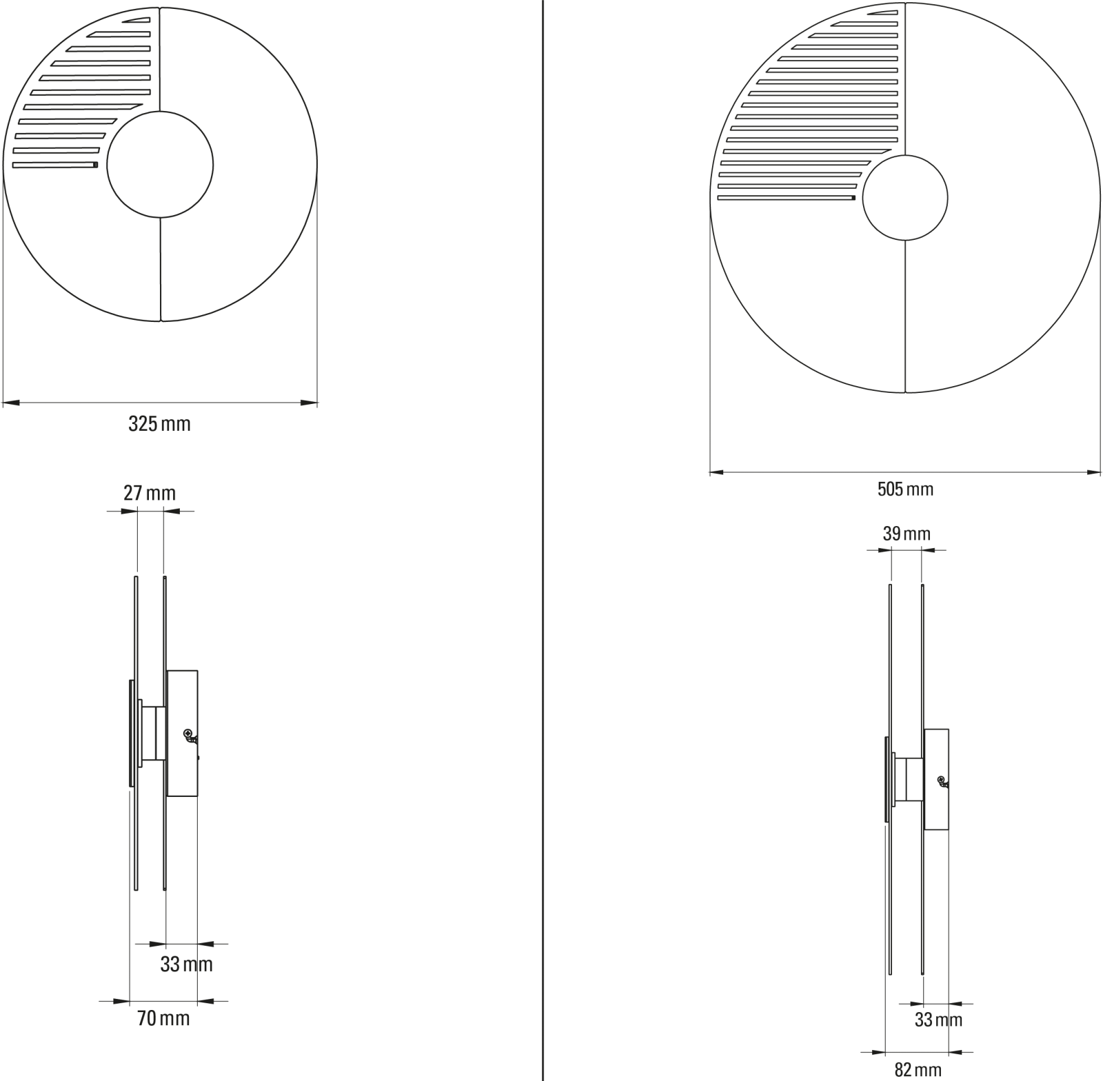 Caractéristiques Matériaux : Aluminium et verre Finitions : Solid ou Stripes Sources : CL-Integrated LED 2700K (Dimmable) Poids : -Taille 1 : 1.3 Kg -Taille 2 : 2.1 Kg Taille -Diamètre 325mm, épaisseur 70mm (390 €) -Diamètre 505mm, épaisseur 82mm (522 €)