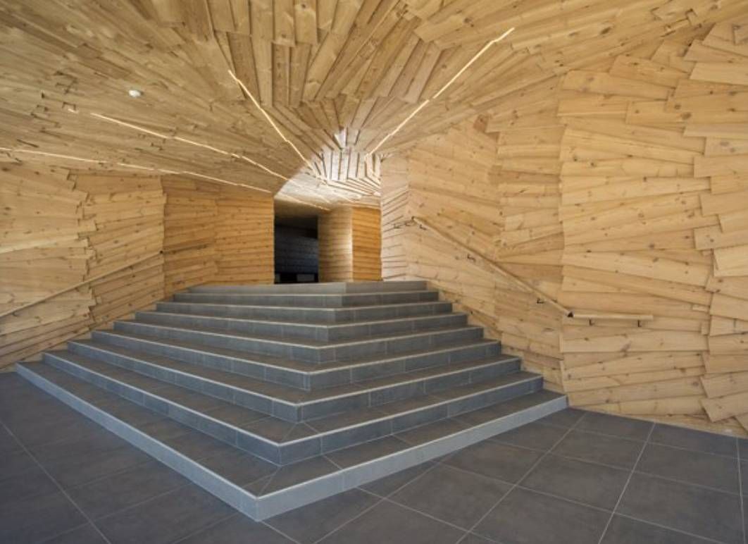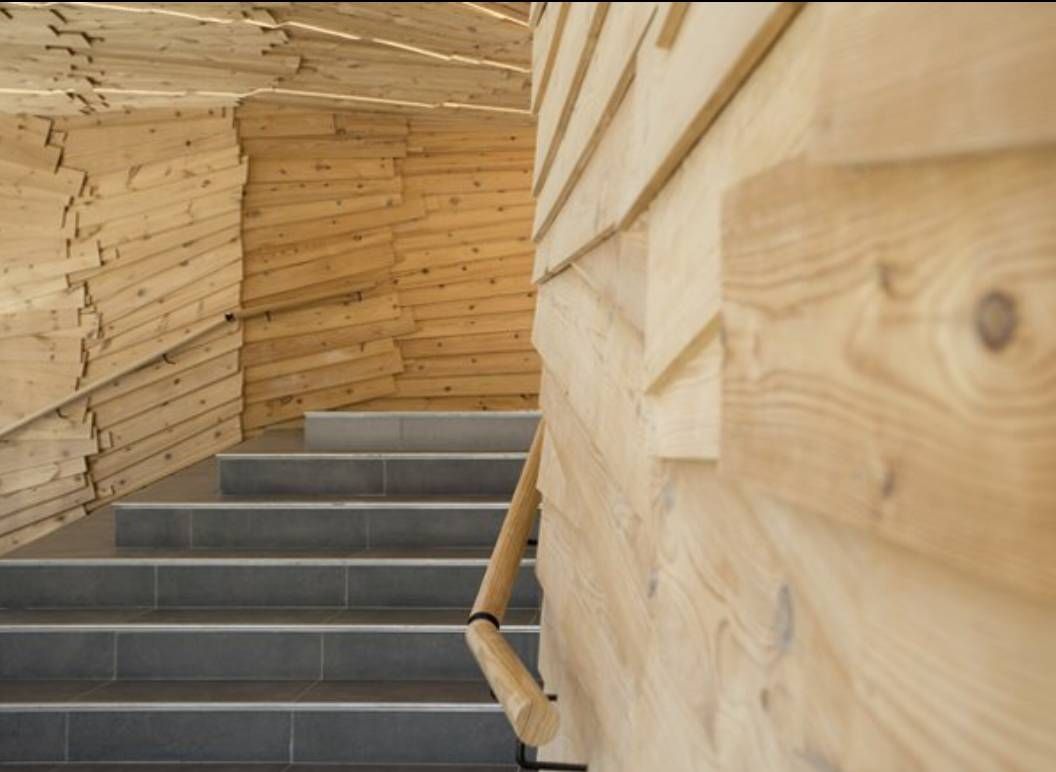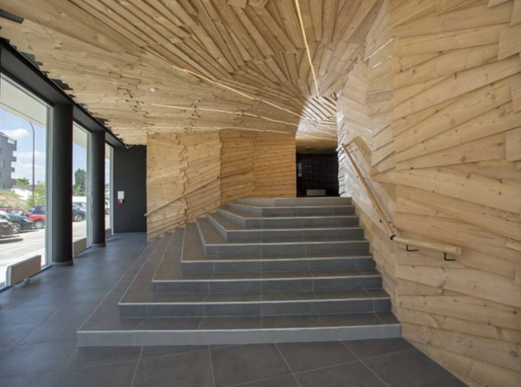 Mise en lumière du Hall de la résidence PÜR à Talence (Cabinet d'Architecture King Kong) par des rubans LED sur décor en bois.