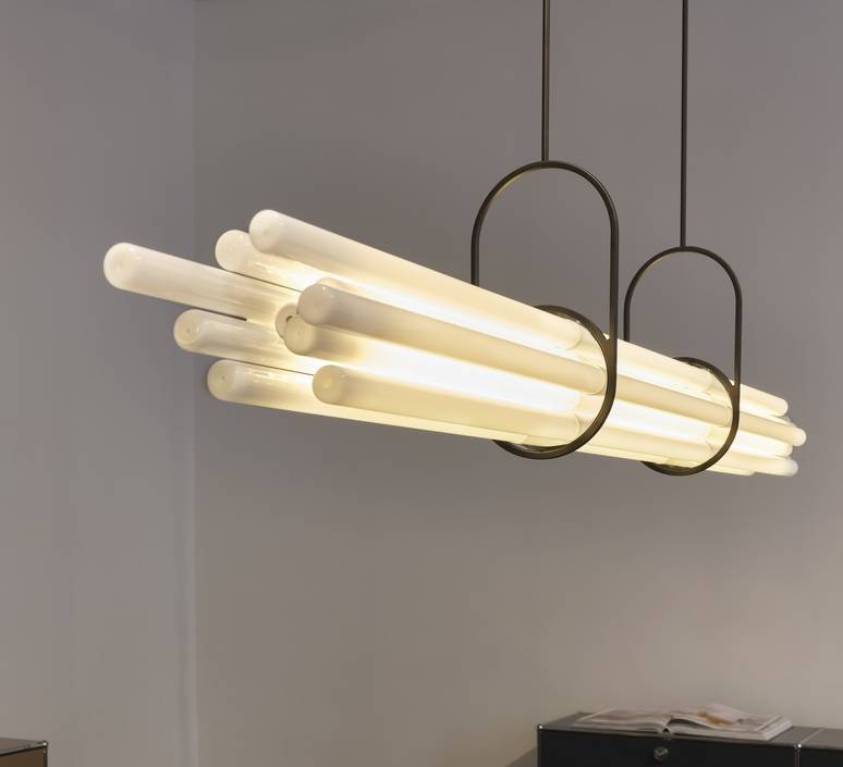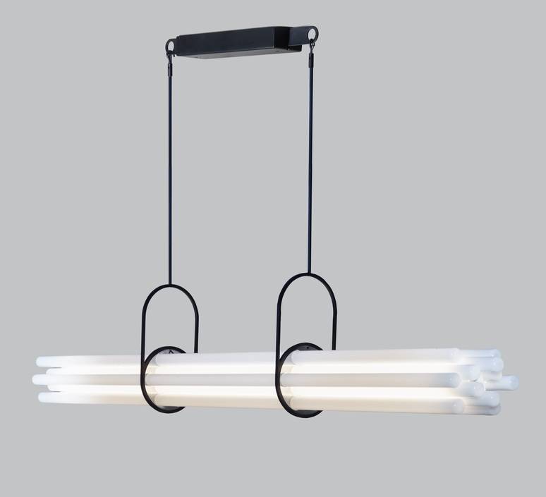Dans ce nouveau modèle, le designer nous démontre son savoir-faire artisanal et sa connaissance de la métallurgie. Pensé comme un trompe l'œil, le luminaire NL 12 est constitué de 12 tubes en borosilicate. Seul un de ces tubes est une source de lumière et se réfléchit à travers les autres pour propager ce rayonnement céleste. Les tubes sont regroupés et maintenus par 2 arceaux en aluminium noir, rattachés par des tiges à la rosace de fixation au plafond. Cette disposition rappelle alors un agrès de gymnastique qui offre à cette suspension une note athlétique et brute. Par cette création, Sébastien Summa nous prouve encore une fois son agilité en ne laissant aucune structure ni fil apparents.