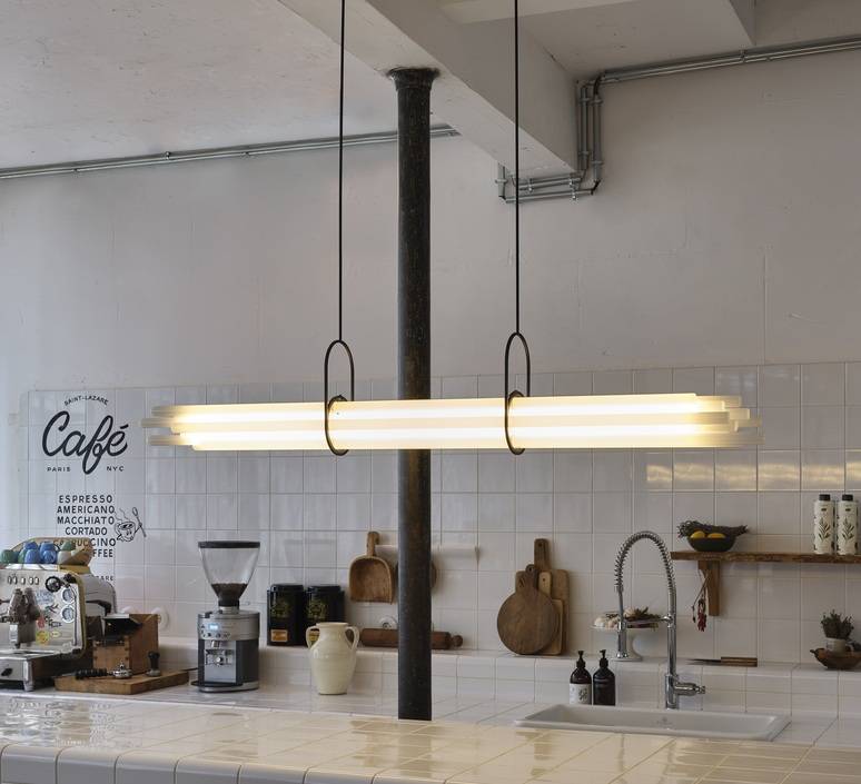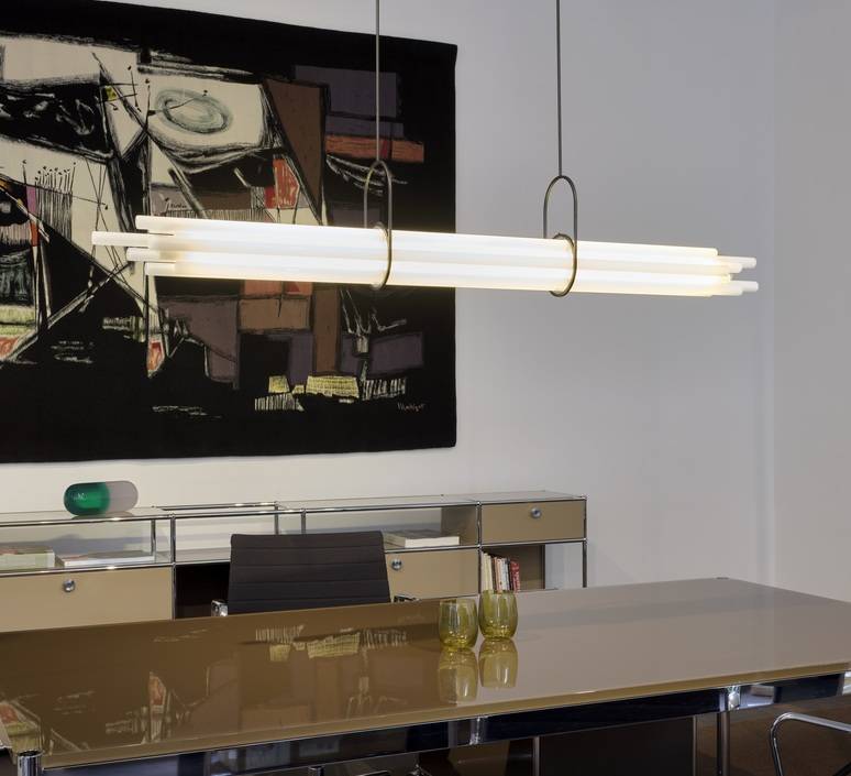 Avec son design industriel sophistiqué et grâce à sa longueur de 130 cm, la suspension NL 12 est idéale pour éclairer une grande table de salle à manger.