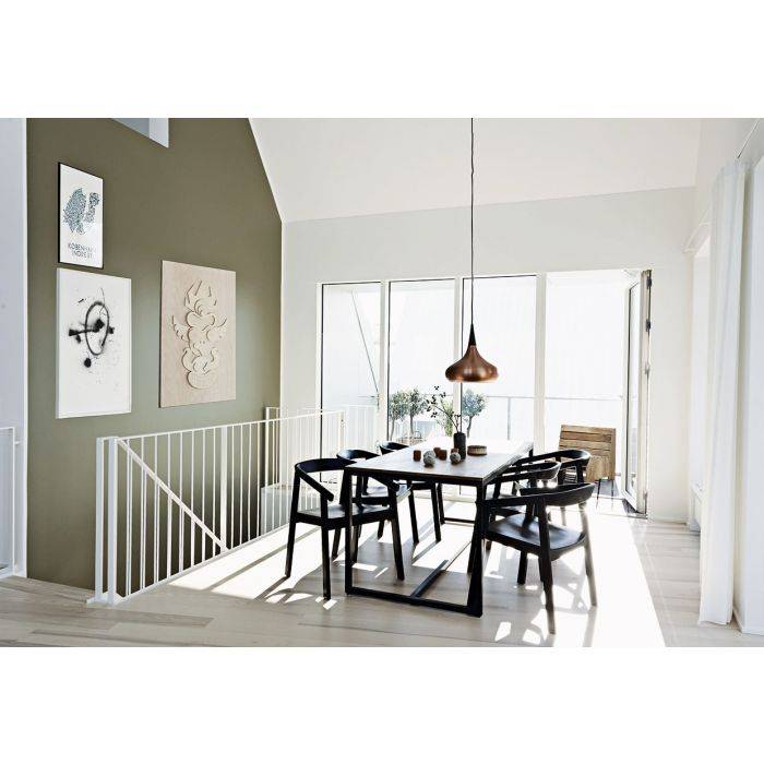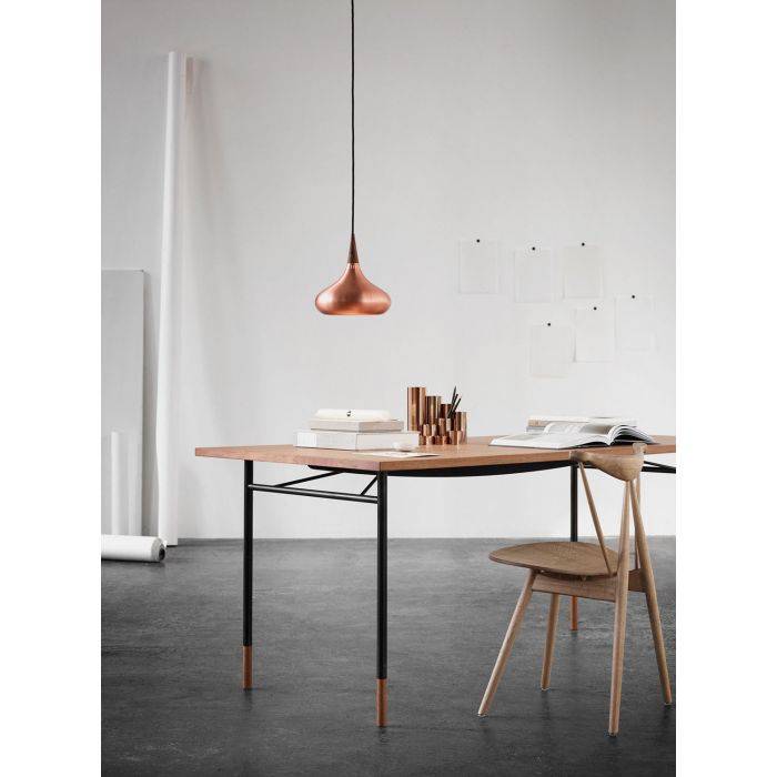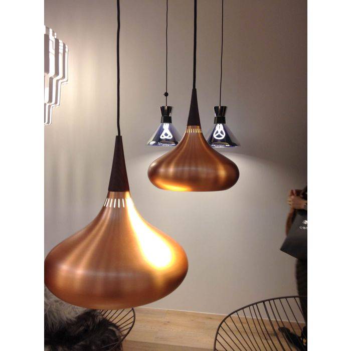 La suspension Orient est une conception de lumière impeccable avec une bonne efficacité lumineuse et fabriquée à partir des matériaux de première qualité. Le mode d'expression organique relie la lueur profonde et le cuivre dynamique. La couleur de la suspension créé un lien naturel avec le cordon noir textile tissé. La lampe dispose de 24 fentes étroites verticales au sommet de la suspension permettant à la lumière de filtrer à travers. Le montage dissimule élégamment la source de lumière de faible énergie et assure une lumière douce et agréable sans éblouissement. Une suspension design et moderne pour tout type de décoration.