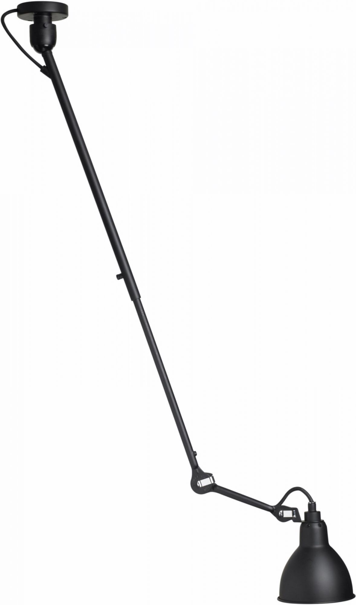 L’ensemble de ce luminaire est recouvert de noir satiné. Son bras ajustable mesure de 55 aà 92cm et son abat-jour a un diamètre de 14cm, et sa hauteur est de 14 cm. Le plafonnier N°302 Lampe Gras est livré sans ampoule. Nous recommandons une ampoule E14 de max 11W.