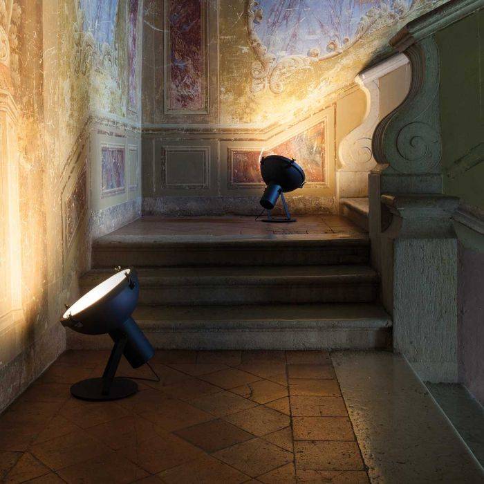 Projecteur 365 est un lampadaire d’intérieur fabriqué en aluminium verni de couleur bleu nuit, blanc sablé ou moka. Le diffuseur bombé est en verre et sablé à l’intérieur. Les écrous et la visserie sont chromés en noir. La hauteur est de 38cm et le diamètre du diffuseur de 37 cm. L’interrupteur se trouve sur le câble de 2,9m. La source lumineuse n’est pas fournie. Nous vous conseillons une ampoule LED E27, 150W.
