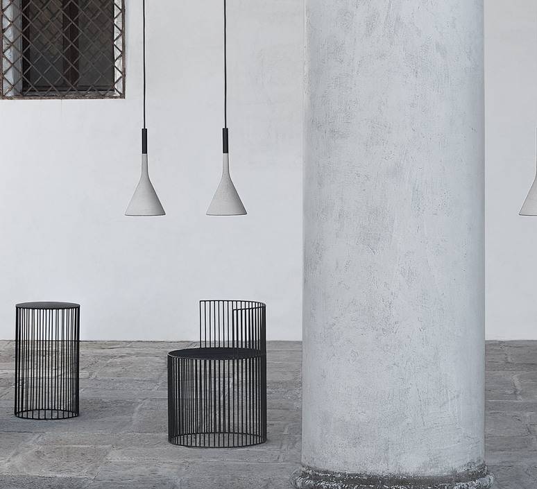 Cette suspension en béton brut Aplomb est signée du duo de designer Lucidi et Pevere est éditée par la maison italienne Foscarini en 2014.