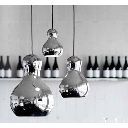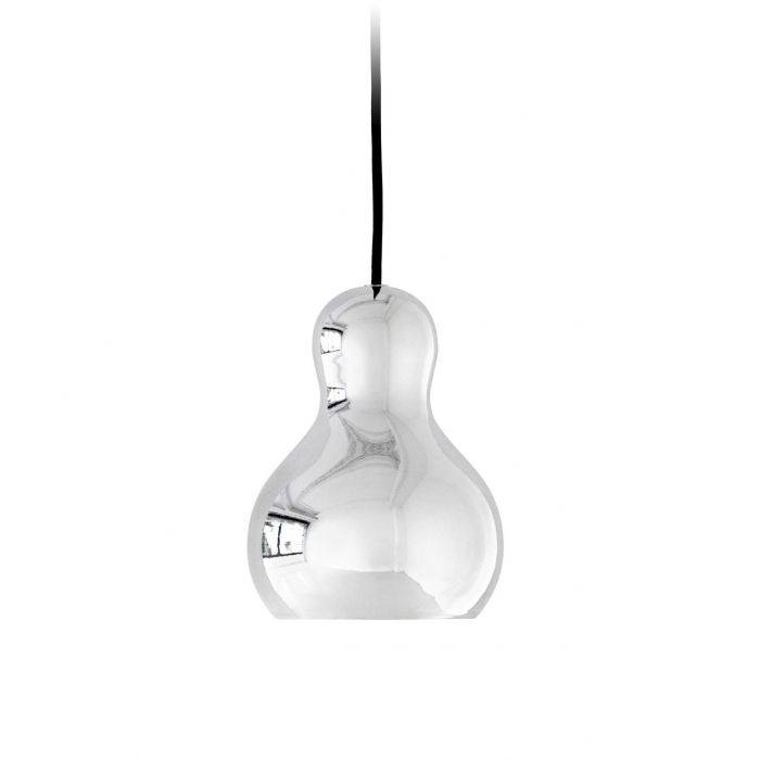 Trois tailles sont présentés dans la même forme facilement reconnaissable, sans pour autant être identiques. Les nuances sont faites d'aluminium dessiné et fini avec une couche chromée reflète l'environnement. Le modèle Calabash, qui est équipé d'un réflecteur pour augmenter la lumière vers le bas, émet une lumière chaude sans éblouissement. le cordon noir en textile crée un contraste impressionnant de la surface animée chromé. La suspension génère une atmosphère chaleureuse.