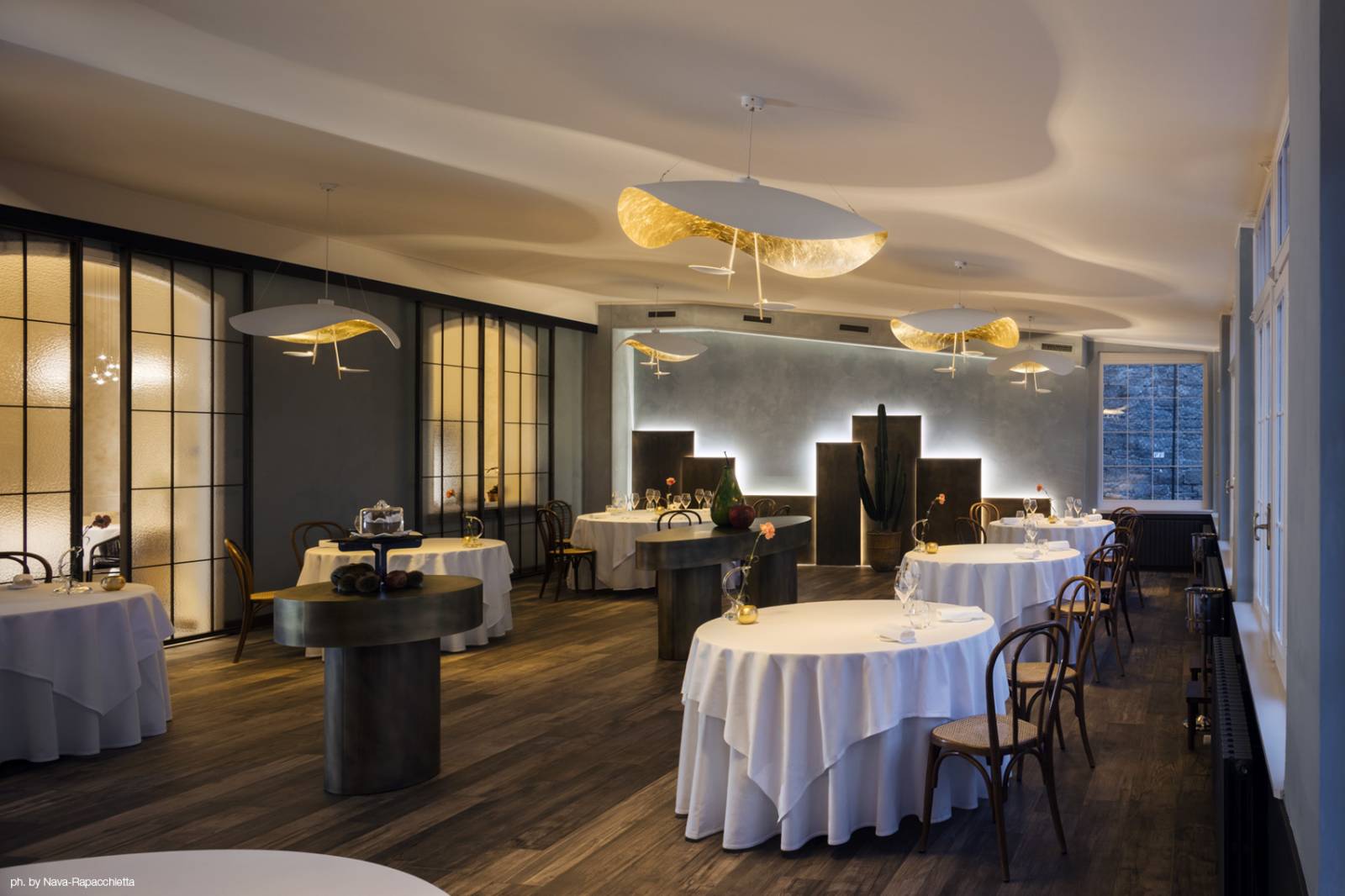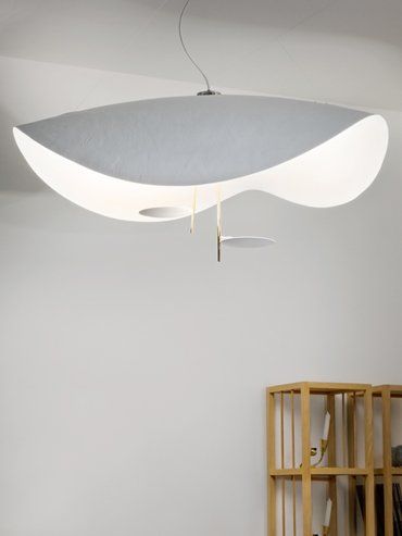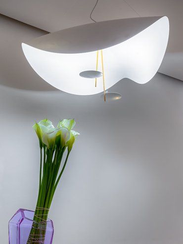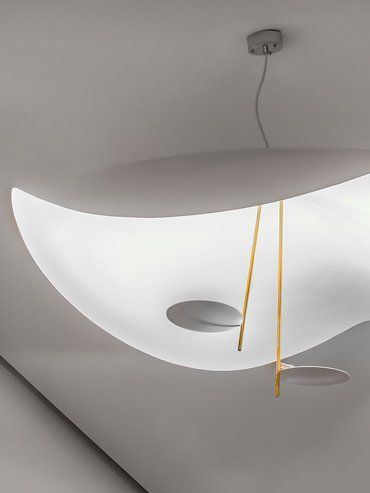 Lederam représente la rigueur du geste fait pour tracer une ligne, tandis que les disques aux couleurs chaudes et douces renferment un module LED ultra-plat, qui permet de créer des lampes minces et des formes suspendues aux lignes courbes et sinueuses.